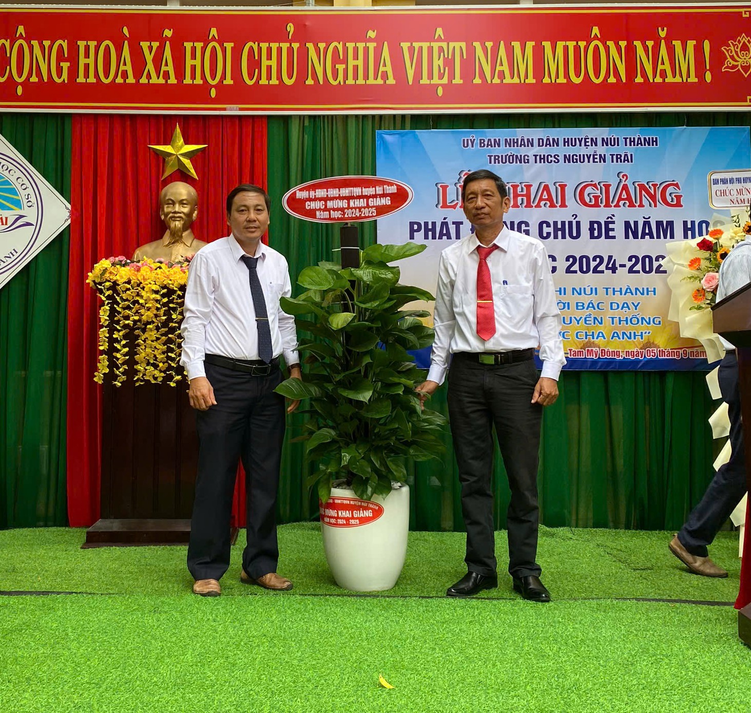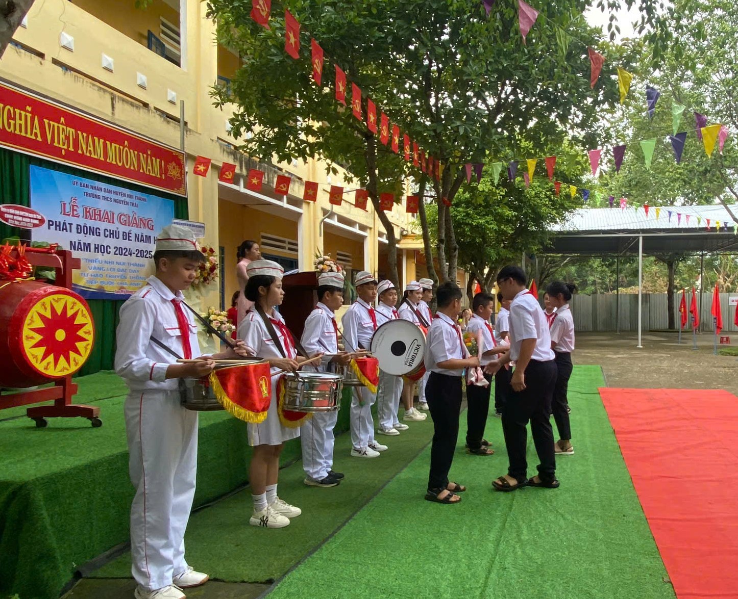 Hòa chung với không khí của ngày Hội toàn dân đưa trẻ đến trường, Thực hiện Quyết định số 1898/QĐUB của UBND tỉnh Quảng Nam về việc Ban hành Kế hoạch thời gian năm học 2024-2025 đối với giáo dục mầm non, giao dục phổ thông và giáo dục thường xuyên; Công văn số 18 ngày 30 tháng 8 năm 2024 của Hội đồng Đội huyện Núi Thành “V/v tuyên truyền, giới thiệu, phát động chủ đề năm học 2024 - 2025” . Hôm nay, ngày 5 tháng 9 năm 2024, thầy và trò trường THCS Nguyễn Trãi long trọng tổ chức Lễ Khai Giảng và phát động chủ đề công tác Đội năm học 2024-2025.